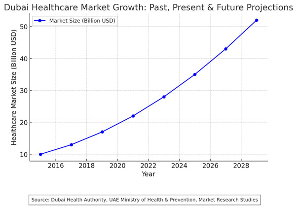 The healthcare industry in Dubai has witnessed significant growth over the years, with continued expansion expected in the coming decade. The graph below illustrates the past, present, and projected growth of Dubai’s healthcare sector.